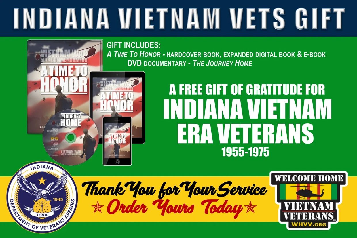 A collaboration with the Indiana Department of Veterans Affairs (IDVA) & Welcome Home Vietnam Veterans (WHVV) established the Indiana Vietnam Veterans Gift as an outreach program to honor and give thanks to Indiana Residents who served during the Vietnam War years of 1955-1975.